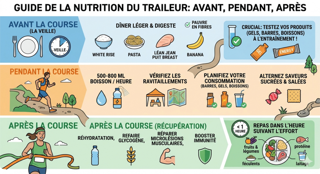 Avant la course : la veille, optez pour une alimentation légère, digeste et pauvre en fibres afin d’éviter tout inconfort. Un dîner composé de glucides simples (riz, pâtes blanches), d’une protéine maigre et d’un fruit bien toléré est souvent une valeur sûre.